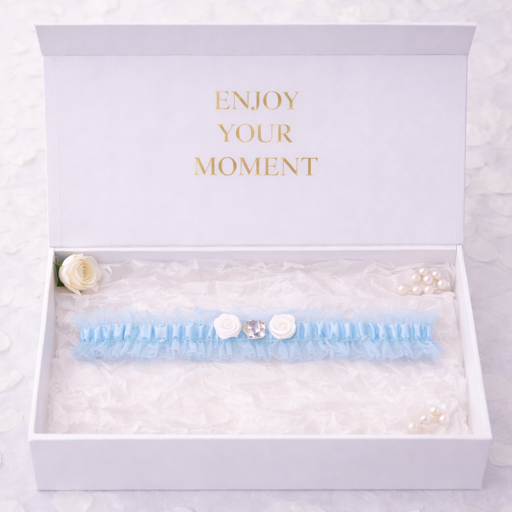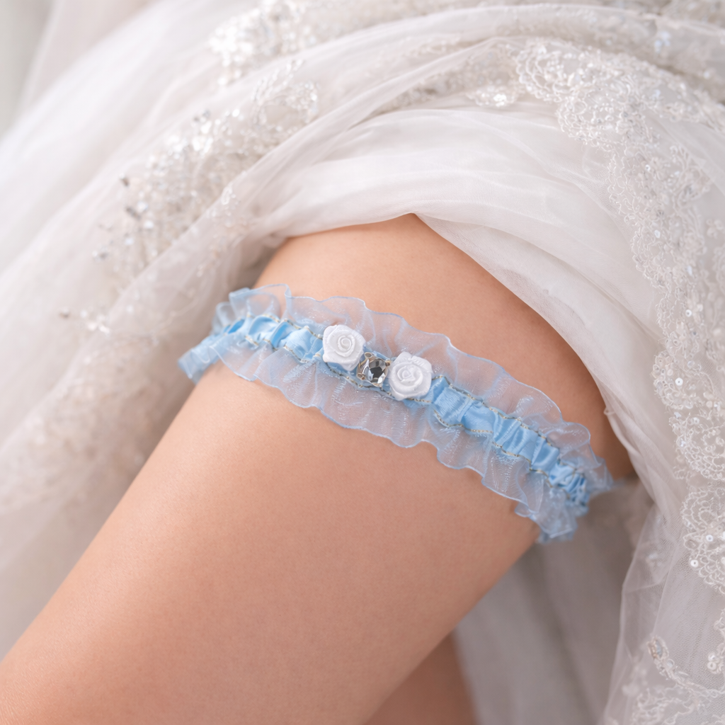 Ein blaues Strumpfband ist ein klassischer Bestandteil der Tradition „etwas Blaues“. Die Farbe Blau symbolisiert Treue, Ruhe und Glück und ist zugleich ein dezentes, elegantes Accessoire für das Brautstyling.