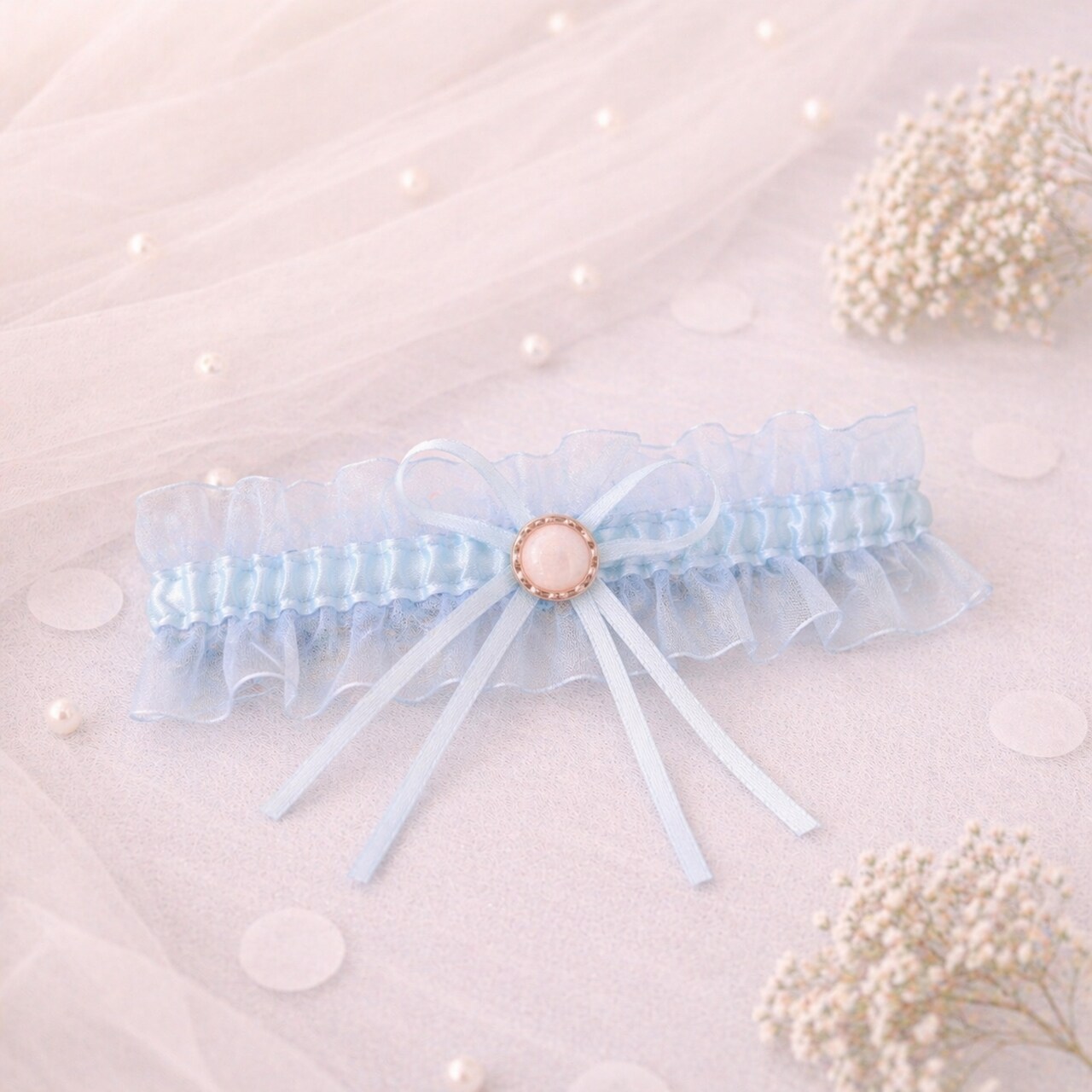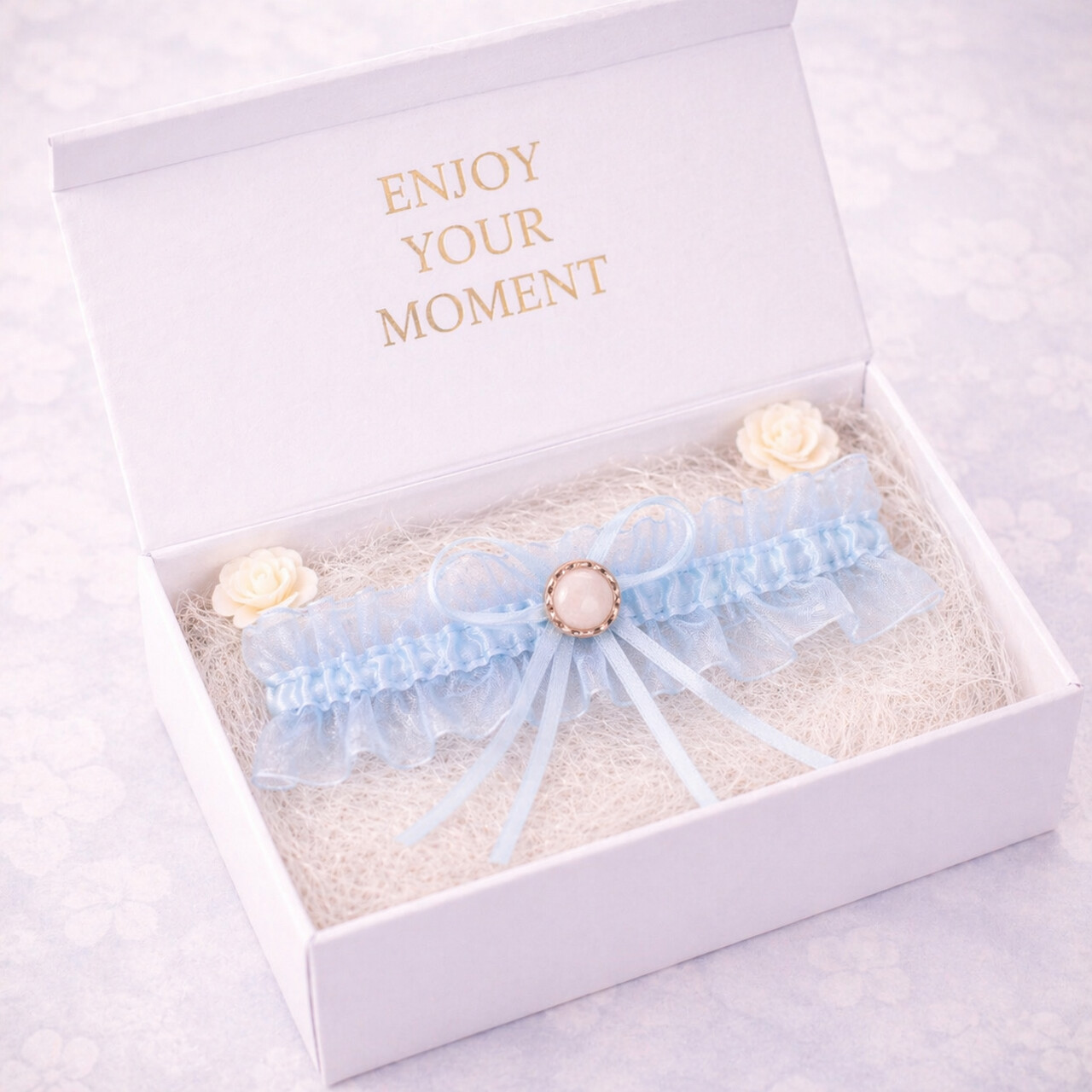 Jedes handmade Hochzeits-Strumpfband entsteht in unserem Studio mit großer Sorgfalt. Weicher Tüll in zartem Blau legt sich sanft an das Bein, während die elastische Passform den ganzen Tag über angenehmen Tragekomfort bietet – von den Vorbereitungen über die Zeremonie bis zur Hochzeitsfeier.