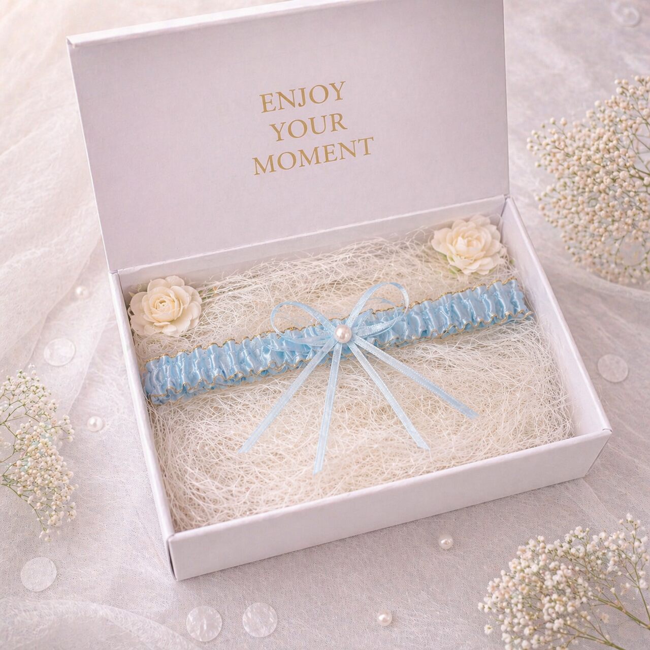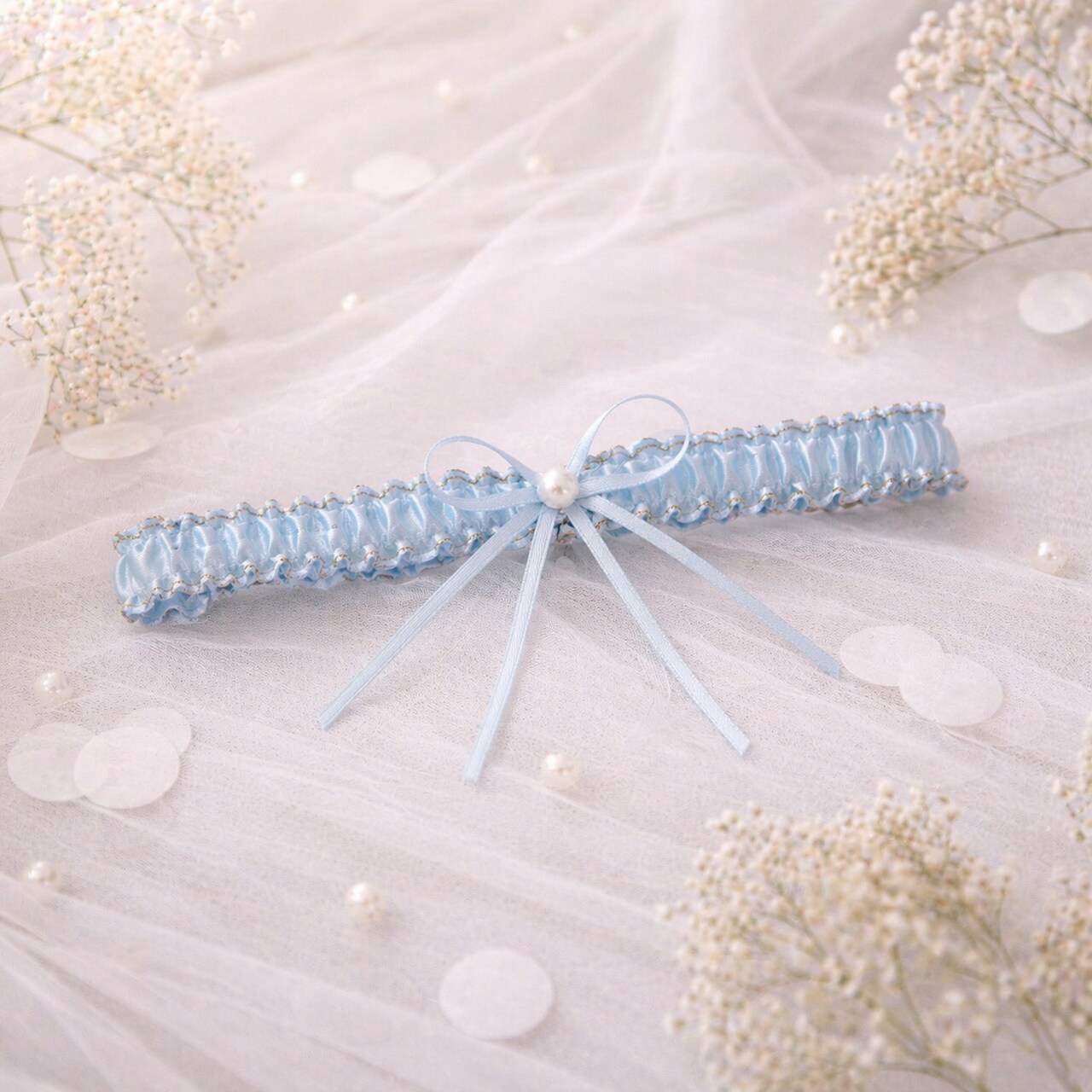 Ein blaues Strumpfband ist ein klassischer Bestandteil der Tradition „etwas Blaues“. Die Farbe Blau symbolisiert Treue, Ruhe und Glück und ist zugleich ein dezentes, elegantes Accessoire für das Brautstyling.