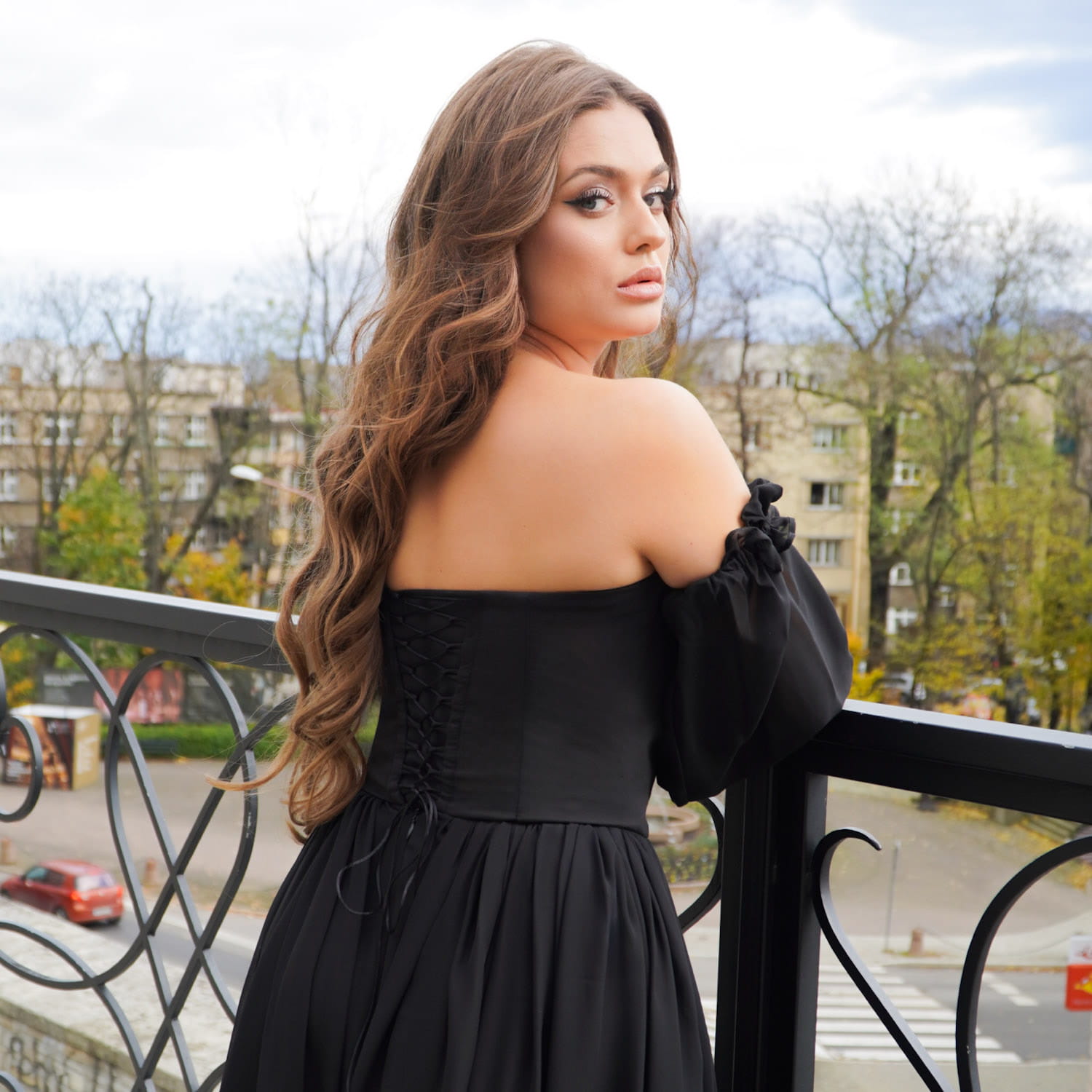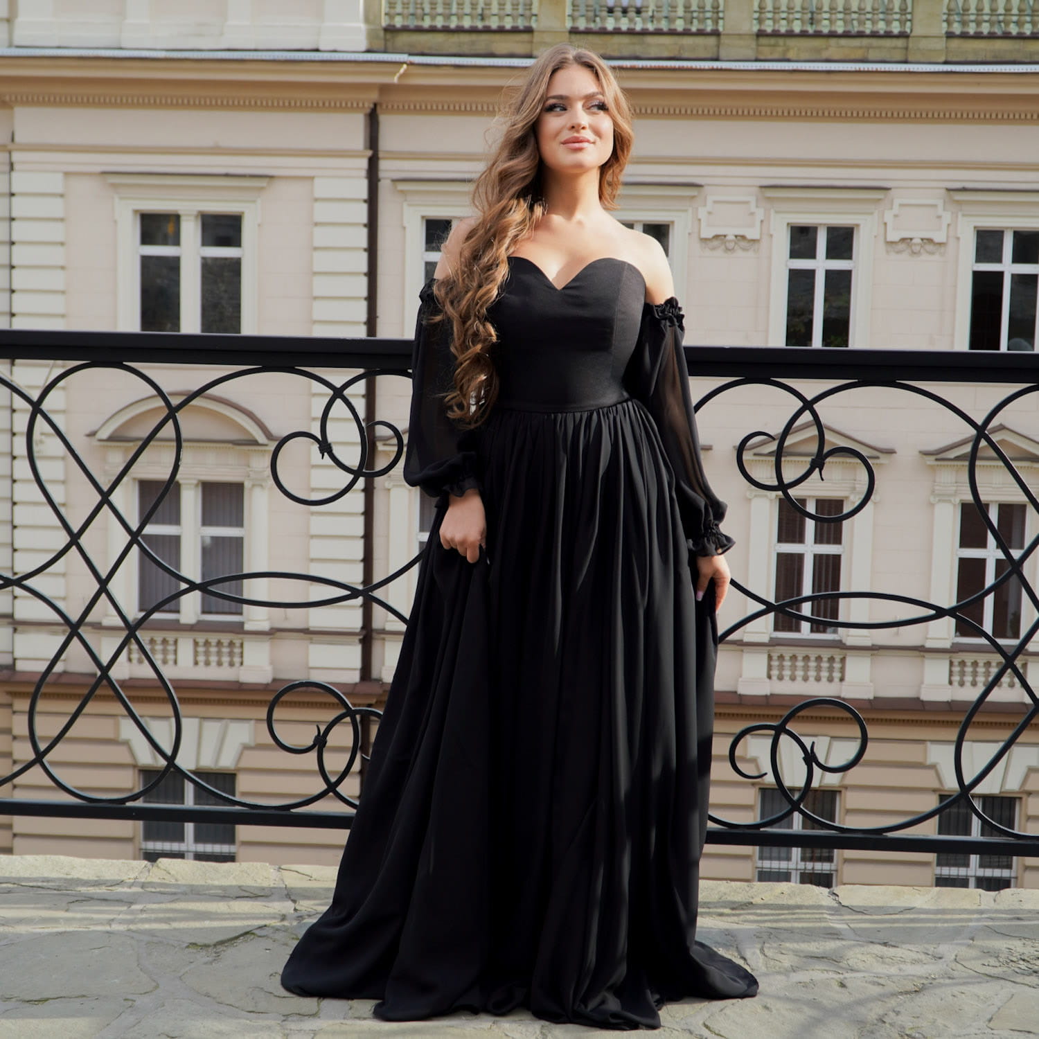 The black gown represents the essence of modern elegance – a black, flowing, corset-style maxi dress with a sweetheart neckline and airy chiffon sleeves. It perfectly combines glamour and timeless sophistication, making it the ideal choice for women who want to shine with class and confidence.