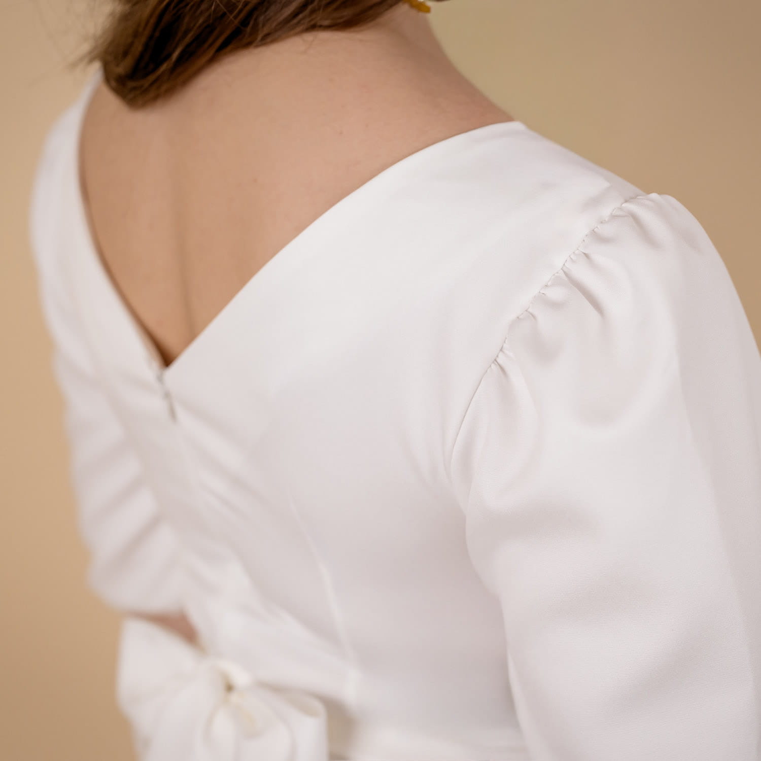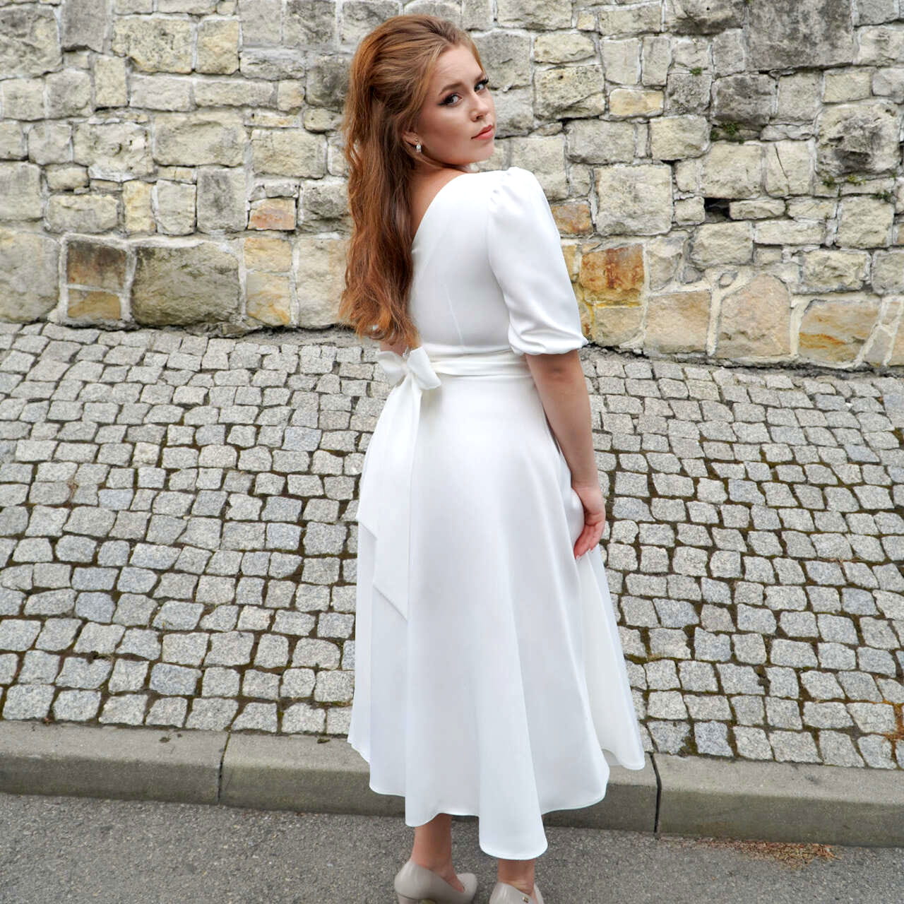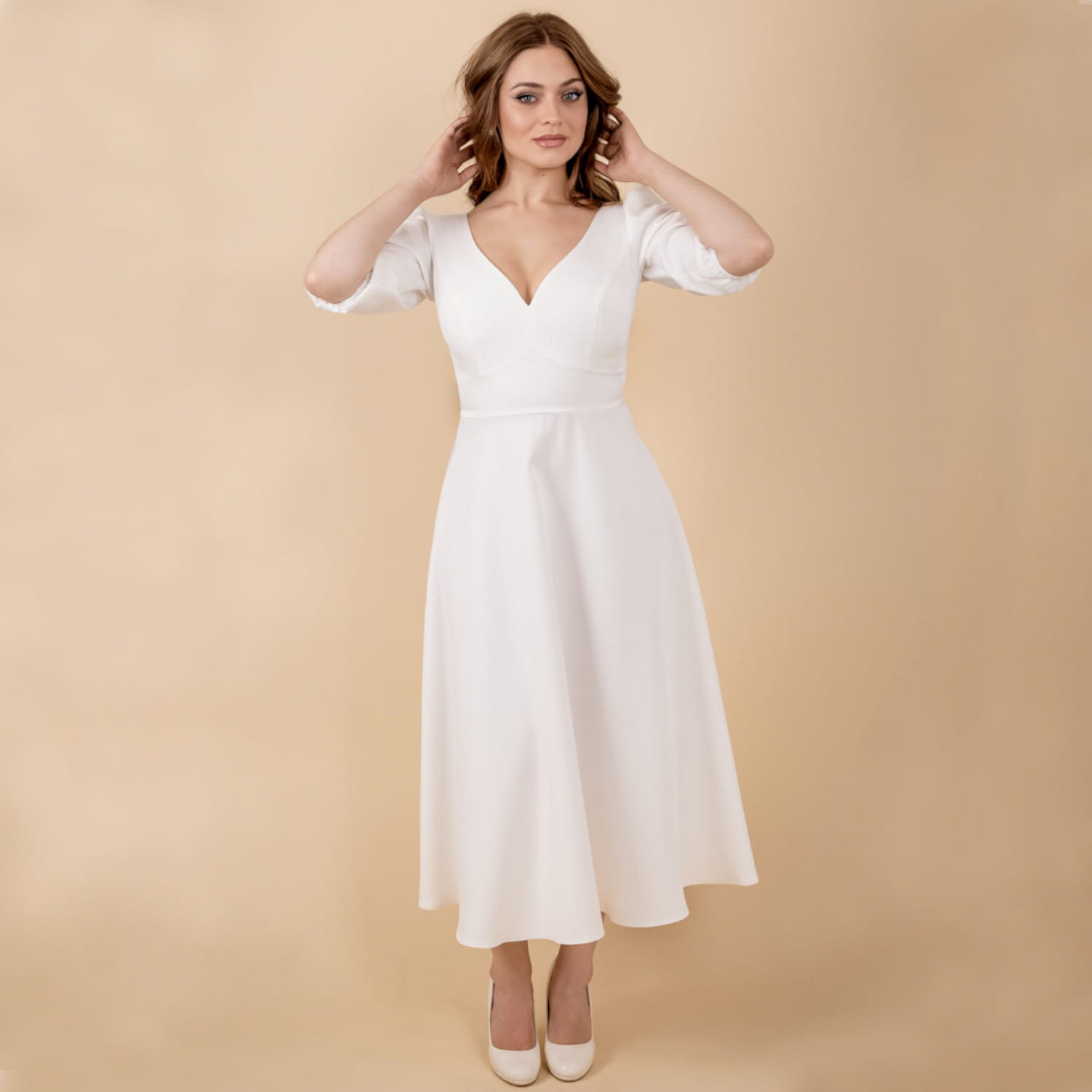 The neutral ecru colour makes it easy to style with various accessories – from classic heels and clutch bags to delicate jewellery or elegant sandals. This is a perfect dress for civil or church weddings, receptions, family celebrations, or any event where elegance, sophistication, and comfort matter most.