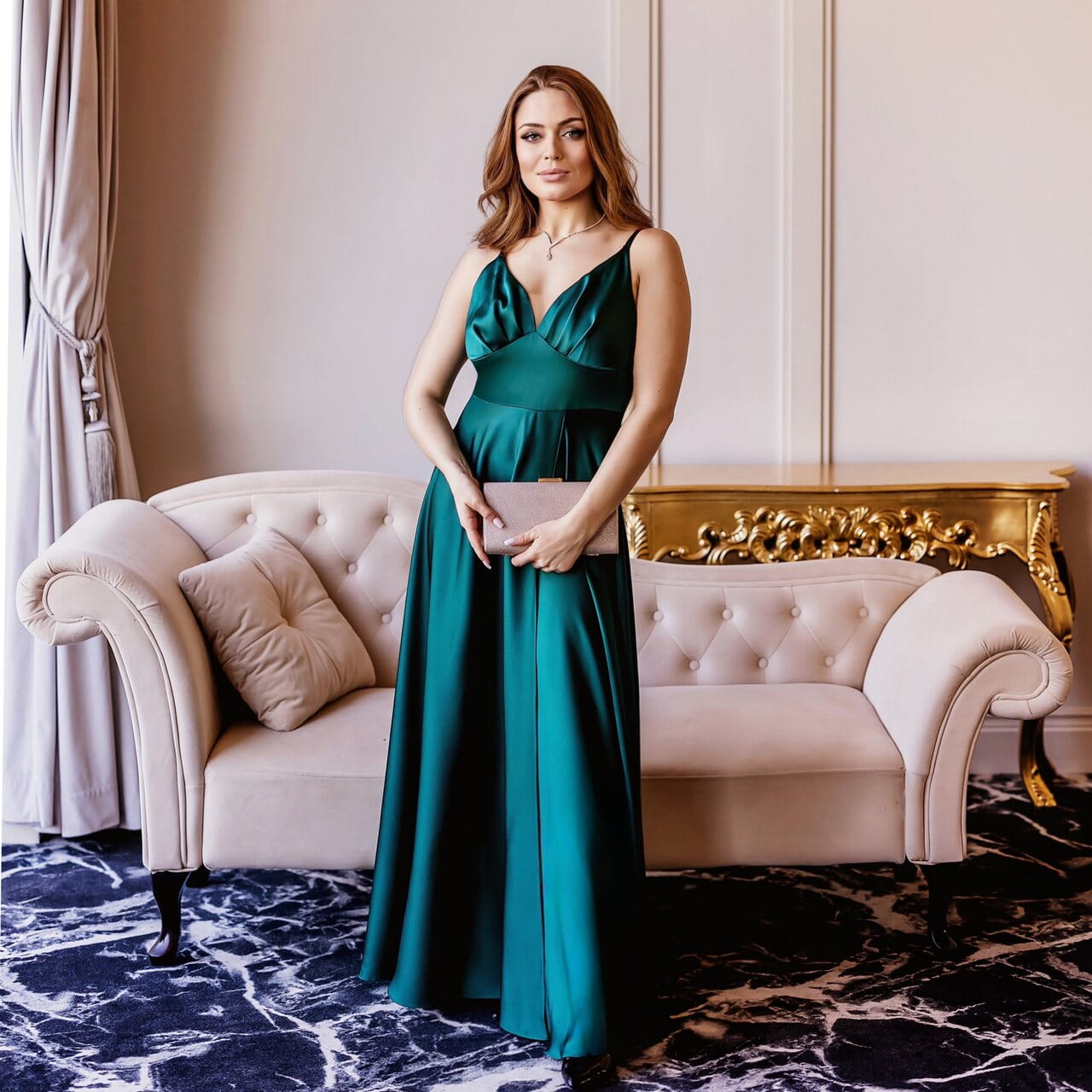 Emerald green is a timeless and sophisticated color full of depth and class. In satin form, it looks even more luxurious, reflecting light subtly and giving the silhouette a radiant glow. That’s why this satin gown in emerald green is perfect both as a wedding guest dress, an evening gown for a ball, or a prom dress. The rich shade flatters many skin tones, enhances natural beauty, and ensures every woman stands out from the crowd.