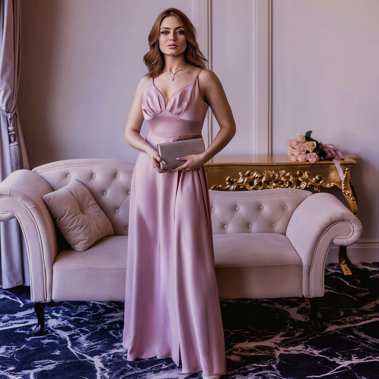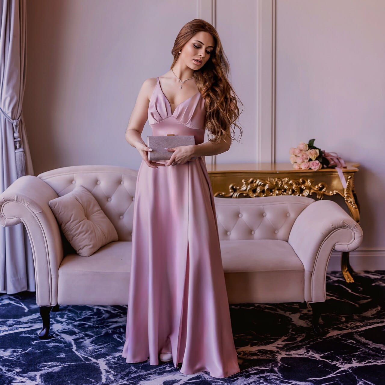 A smooth satin dress like ROSALIE combines elegance, modernity, and feminine sensuality. It’s a strap dress, satin evening gown, and dress with slit, perfect for every woman who wants to feel extraordinary. In powder pink, it looks spectacular, draws attention, and is ideal for the most important occasions.