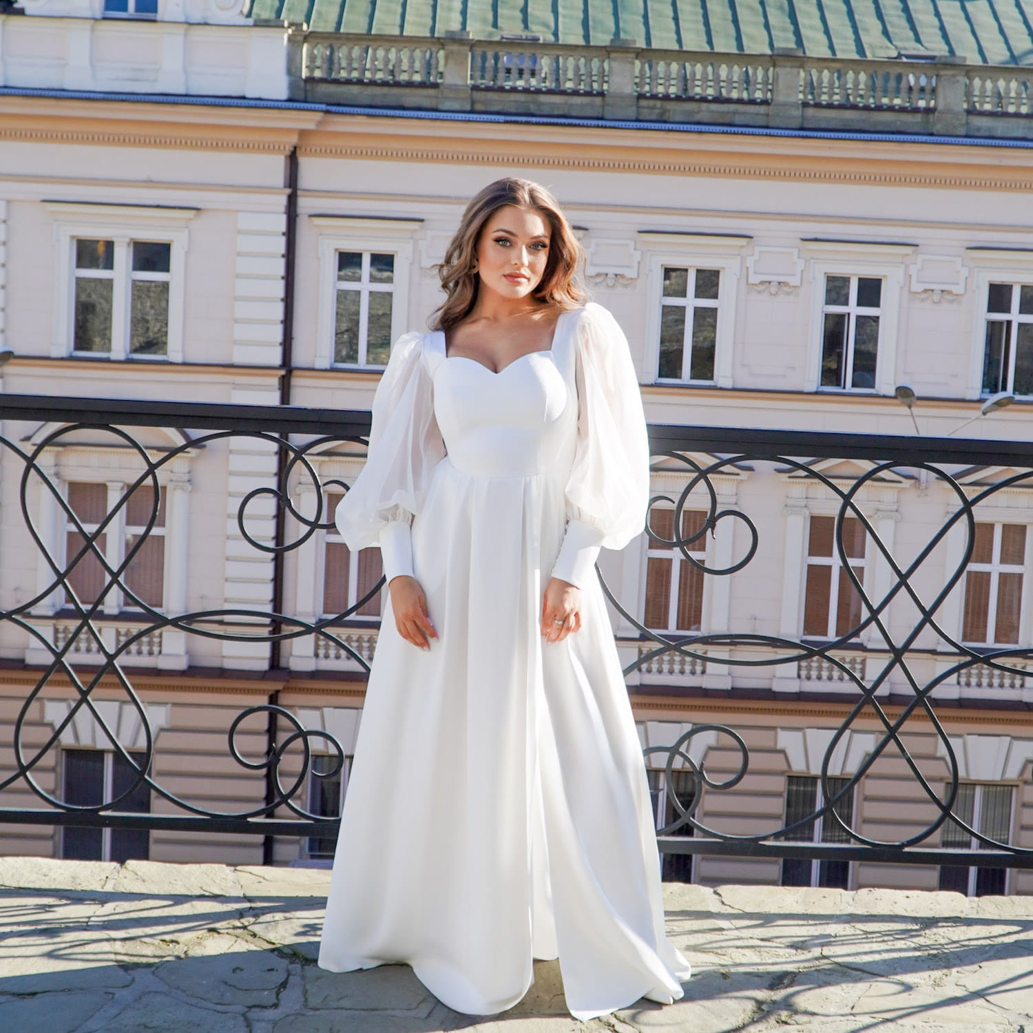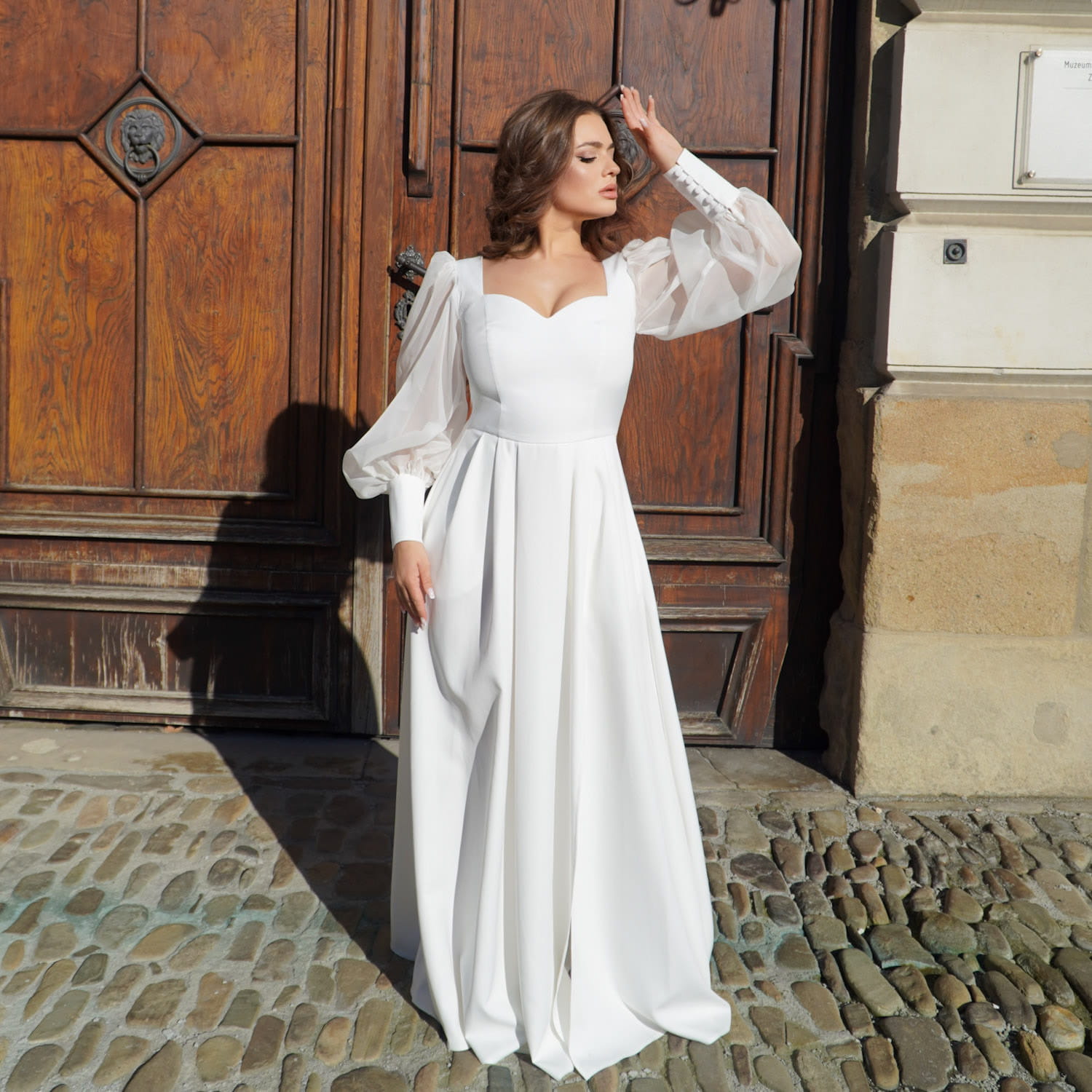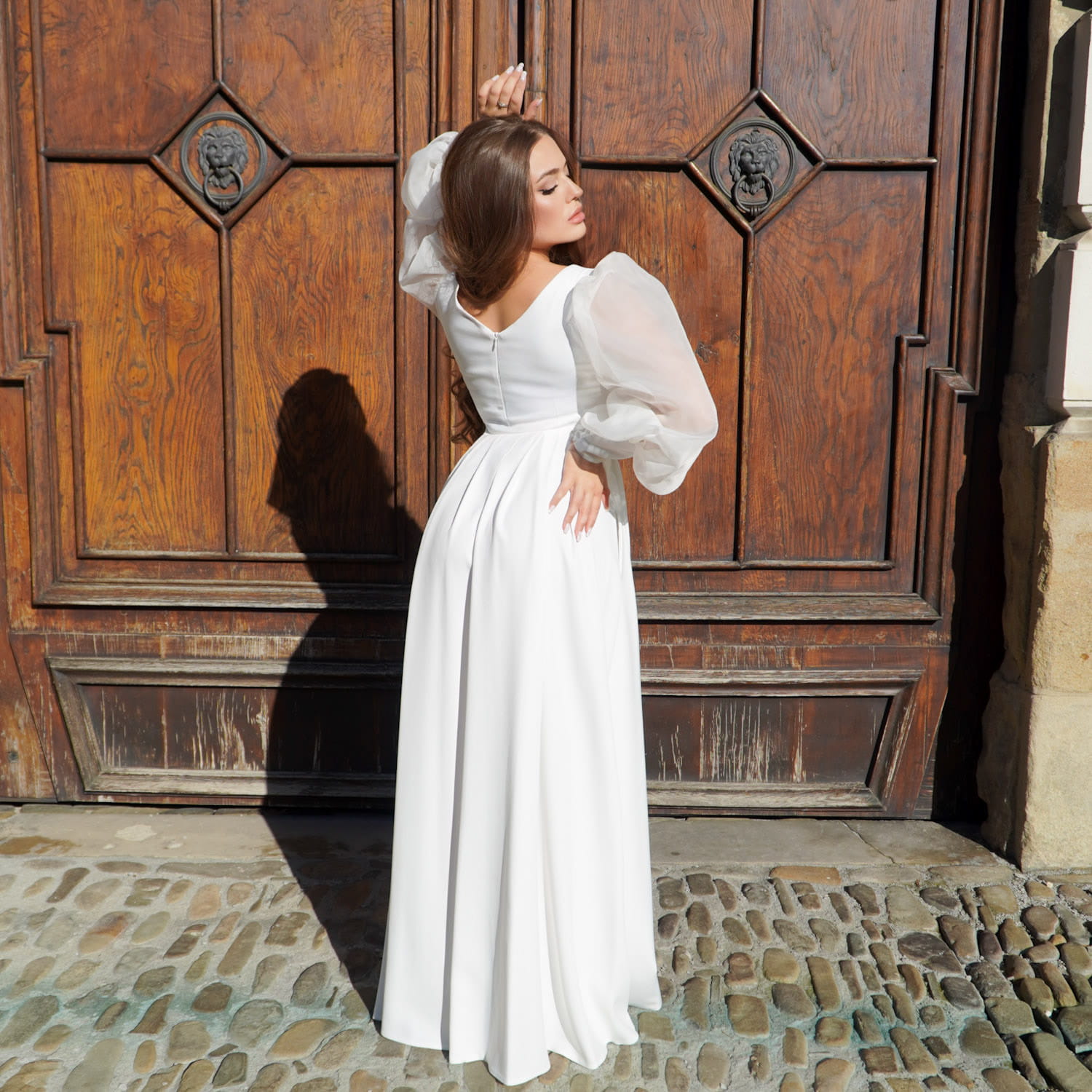 SELENA – Long white wedding dress with puff sleeves and hidden pockets
